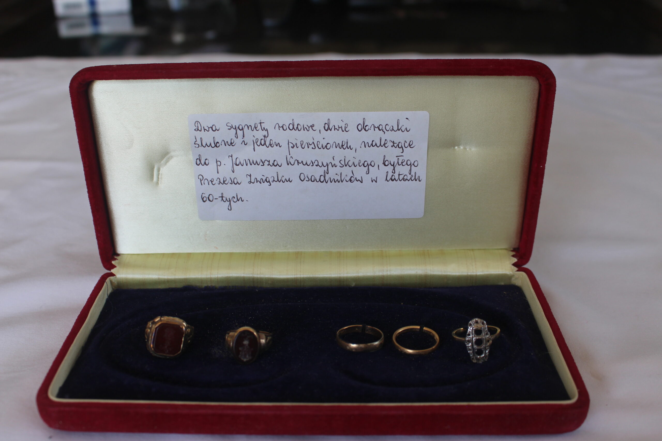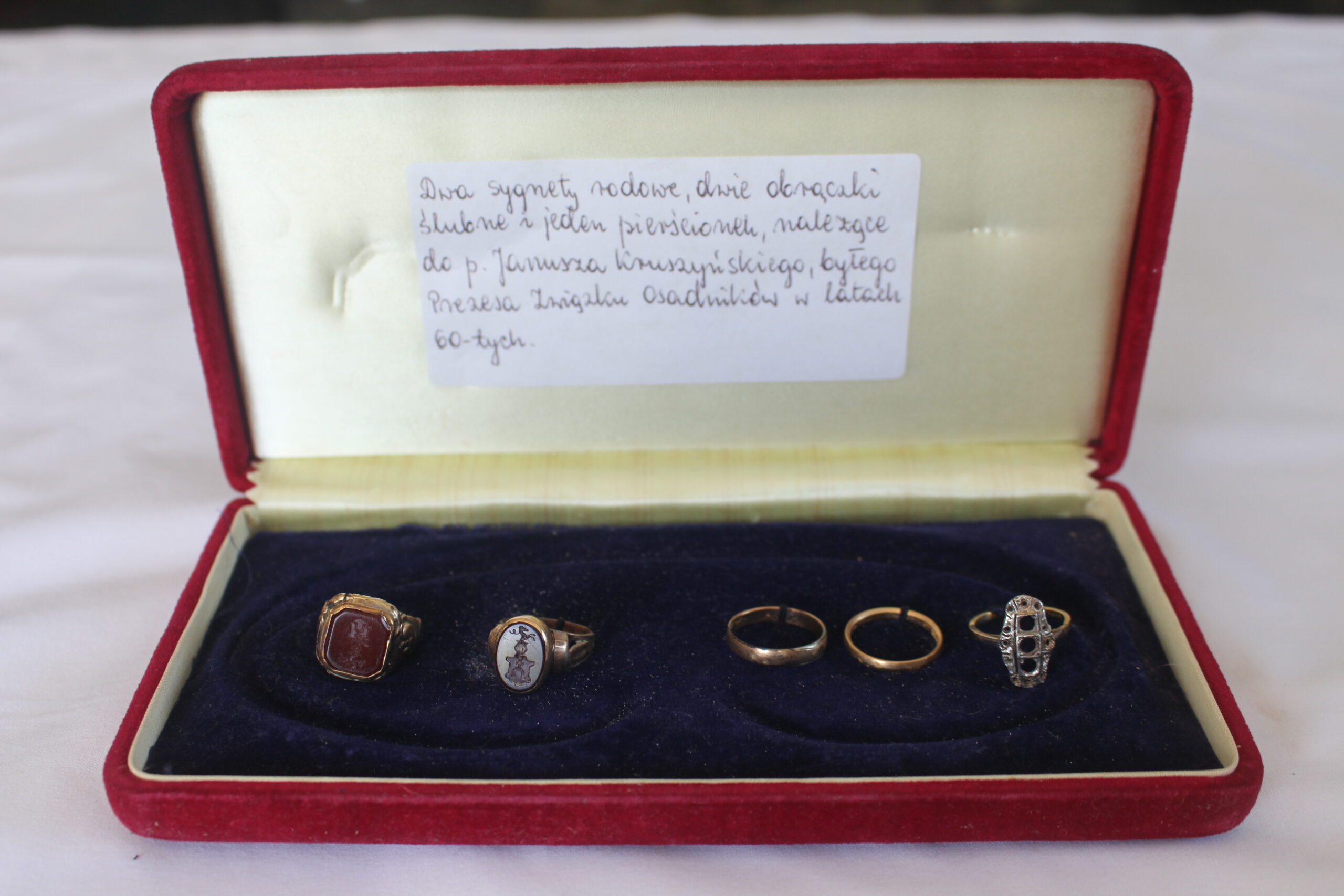 182.35/1.183.Dwa sygnety rodowe, dwie obrączki ślubne i jeden pierścionek należące do p. Janusza Kruszyńskiego, byłego Prezesa Związku Osadników w latach 60. XX wieku.b.d.5 sztuk biżuterii